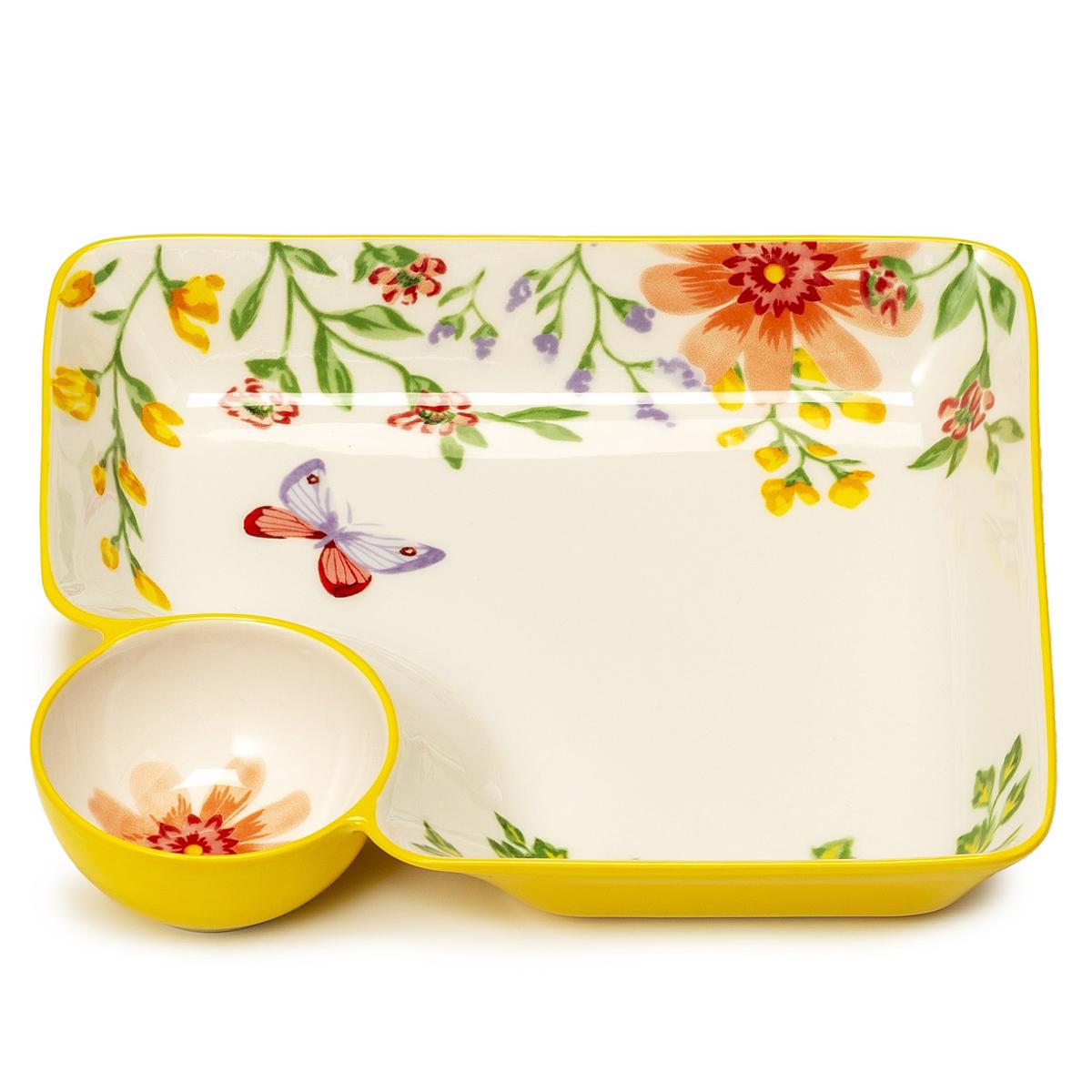Čtvercová servírovací miska je rozdělena na dvě praktické sekce, které umožňují oddělené servírování různých pochutin. Jemný květinový motiv s motýlem a žlutý okraj dodávají nádobě hravý a svěží vzhled. Integrovaná menší kulatá část je ideální na dipy nebo omáčky. Kombinace funkčnosti a dekorativního provedení z ní činí stylový doplněk každého stolu. Povrch je hladký a snadno omyvatelný. Skvěle se hodí pro servírování snacků, oříšků nebo drobného občerstvení.