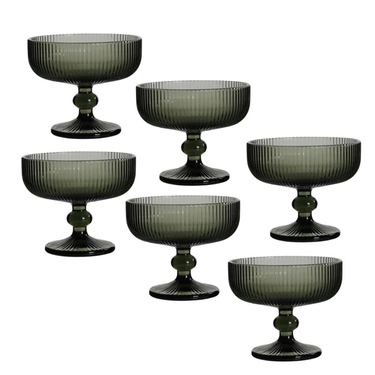 Sada 6 šedých dezertních misek na nožce s vroubkovaným designem. Elegantní řešení pro servírování sladkých pokrmů.